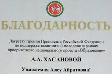 Поздравляем Хасанову Алсу Айратовну, ученицу 10 класса, лауреата премии Президента Российской Федерации по поддержке талантливой молодежи в рамках приоритетного национального проекта "Образование ".