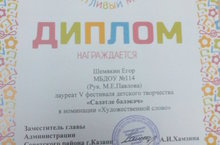 Воспитанник нашего сада ,Шемякин Егор был награжден дипломом лауреата V фестиваля детского творчества "Сэлэтле бэлэкэч", в наминации "Художественное слово". Мы поздравляем Егора с его победой и благодарим его родителей!