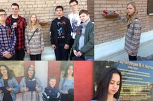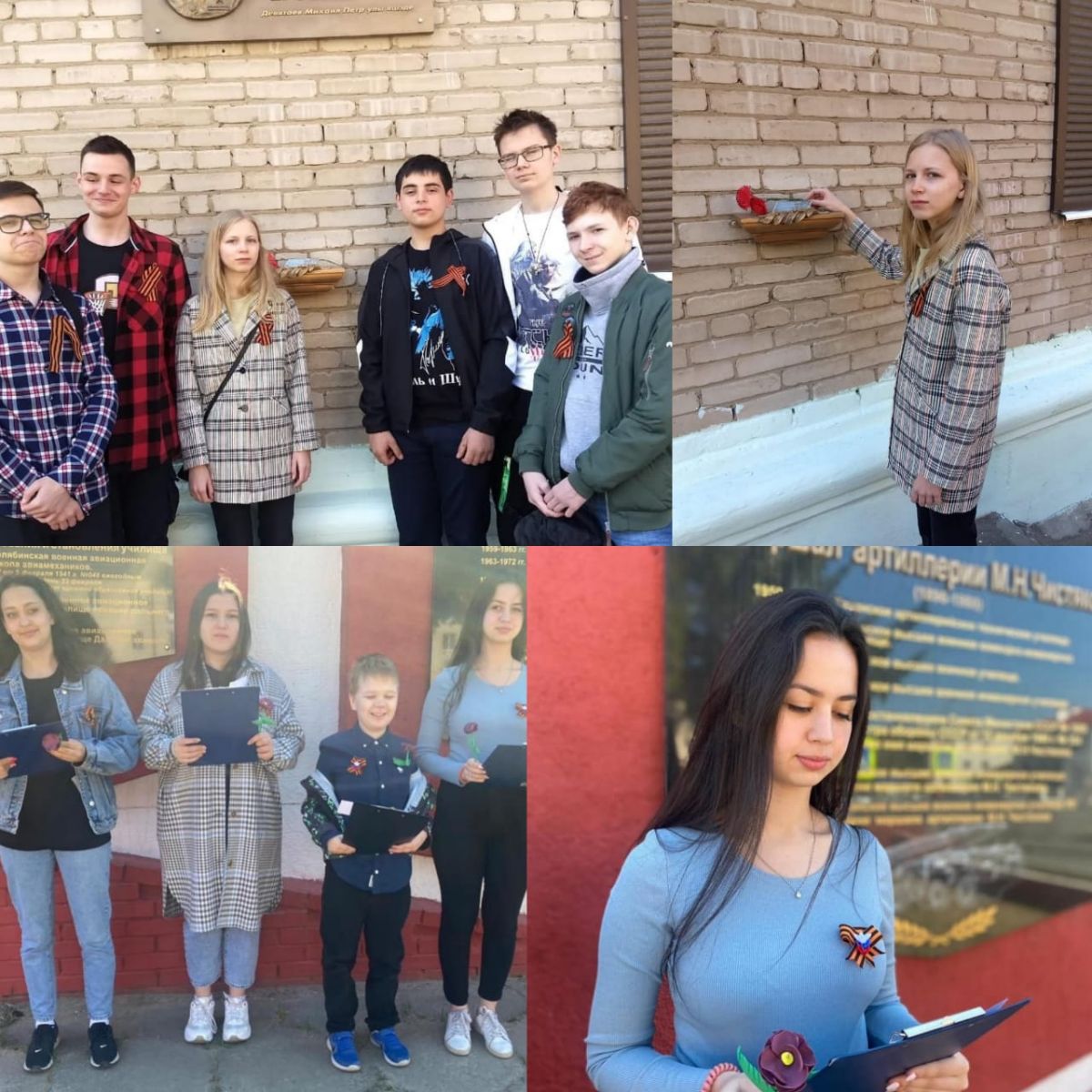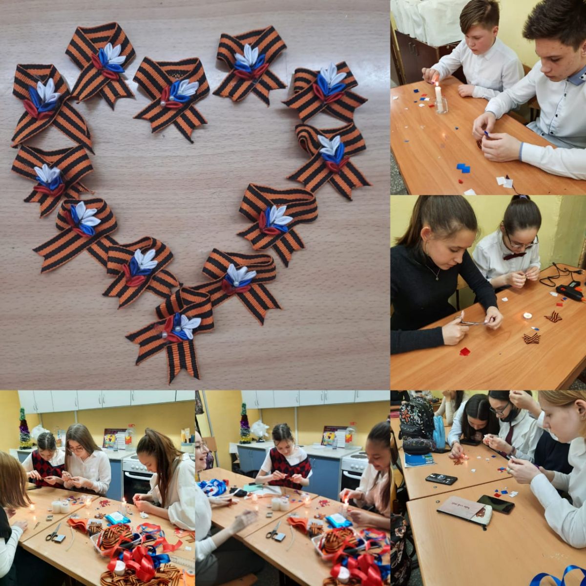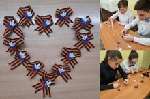 К празднованию Дня Победы учащиеся совместно с учителем технологии Л. А. Манаевой подготовили броши "Георгиевская лента".