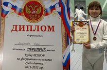 Поздравляем ученицу 5 Б класса Смирнову Киру. Она заняла III место на Кубке РСШОР по фехтованию на шпагах среди девочек, 2011-2012 г.р. Желаем дальнейших спортивных побед.
