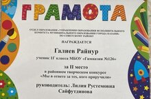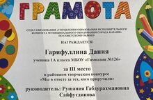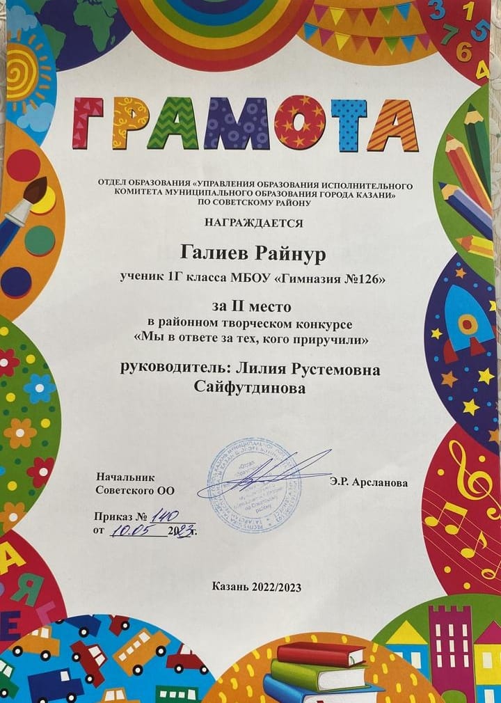 Поздравляем ученика 1Г класса Галиева Райнура. Il место в районном творческом конкурсе "Мы в ответе за тех, кого приручили". Благодарим за подготовку учителя начальных классов Сайфутдинову Лилию Рустемовну. Желаем дальнейших успехов и побед.