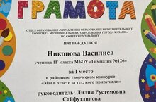 Поздравляем ученицу 1Г класса Никонову Василису. I место в районном творческом конкурсе "Мы в ответе за тех, кого приручили". Благодарим за подготовку учителя начальных классов Сайфутдинову Лилию Рустемовну. Желаем дальнейших успехов и побед.