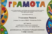 Поздравляем ученика 1А класса Утаганова Риналя. I место в районном творческом конкурсе "Мы в ответе за тех, кого приручили". Благодарим за подготовку учителя начальных классов Сайфутдинову Рушанию Абдурахмановну. Желаем дальнейших успехов и побед.