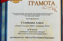 Поздравляем ученицу 3А класса Седойкину Алису. Il место в районном творческом конкурсе "Мы в ответе за тех, кого приручили". Благодарим за подготовку учителя начальных классов Курмаеву Айгуль Рустамовну. Желаем дальнейших успехов и побед.