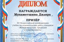 Поздравляем ученицу 8 Б класса, Мухаметшину Диляру, Призер XV Всероссийской конференциии учебно-исследовательских работ учащихся «Живая культура: традиции и современность», НПК проходила в городе Саранске. Желаем дальнейших успехов и побед.