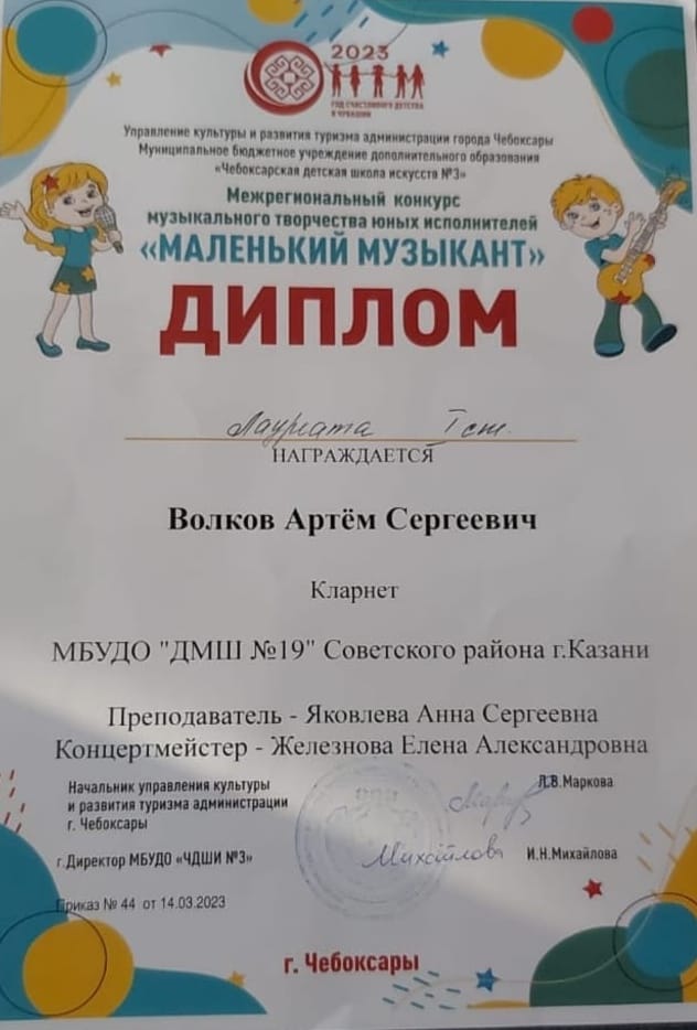 Поздравляем ученика 3Б класса Волкова Артёма с победой - I место в Межрегиональном конкурсе музыкального творчества юных исполнителей г. Чебоксары. Благодарим за подготовку педагогов ДМШ №19 Яковлеву Анну Сергеевну, Железнову Елену Александровну. Желаем дальнейших успехов и побед.
