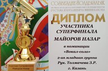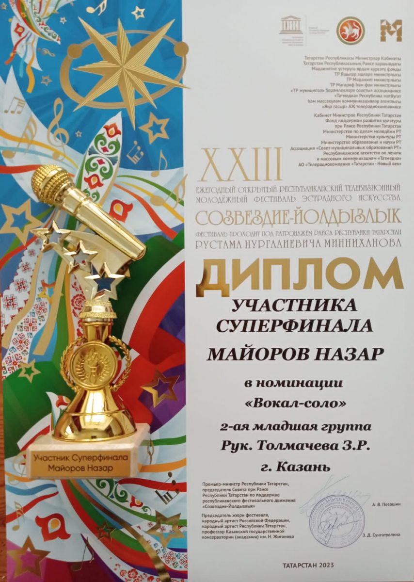 Поздравляем ученика 3 Б класса, Майорова Назара. Он получил Диплом участника супер финала в XXIII Открытого Республиканского телевизионного Молодёжного фестиваля эстрадного искусства "Созвездие-Йолдызлык". Благодарим педагогов ДМШ №7 Толмачеву Земфиру Разиновну. Желаем дальнейших успехов и творческих побед.