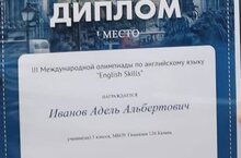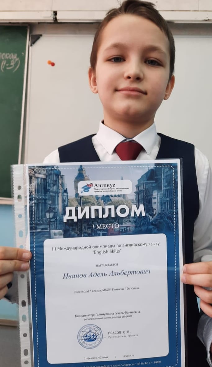 Поздравляем победителя олимпиады по английскому языку ученика 3Б класса Иванова Аделя. Благодарим за подготовку учителя английского языка Галимуллину Гузель Фанисовну.