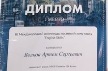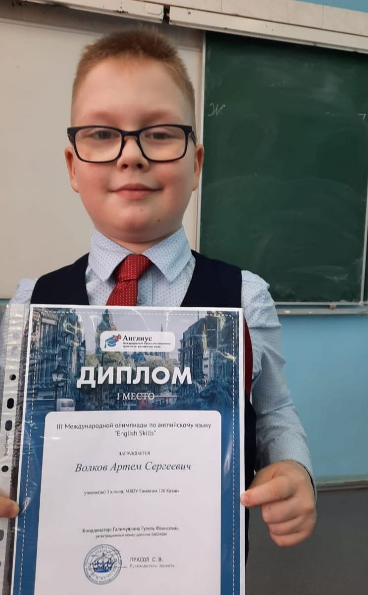 Поздравляем победителя олимпиады по английскому языку ученика 3Б класса Волкова Артёма. Благодарим за подготовку учителя английского языка Галимуллину Гузель Фанисовну. Желаем дальнейших успехов и побед.
