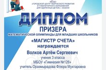 Поздравляем ученика 3Б класса, Волкова Артёма. Он - призёр математической олимпиады для младших школьников. Благодарим за подготовку учителя начальной школы, Оразмырадову Флеру Мухтаровну. Желаем дальнейших успехов и побед.