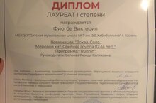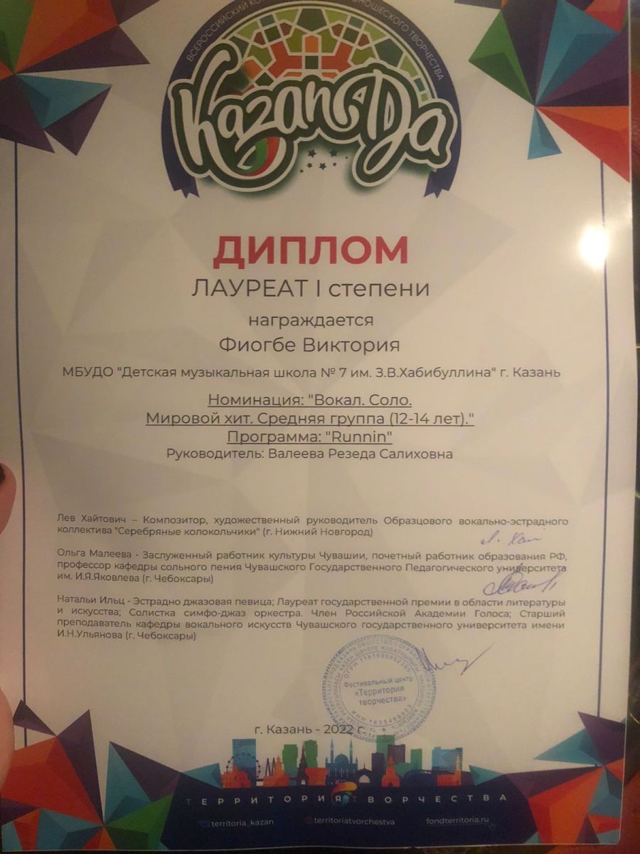 Поздравляем ученицу 6 А класса, Фиогбе Викторию с победой.Благодарим руководителя, Валееву Резеду Салиховну. Диплом I степени. Желаем дальнейших успехов и творческих