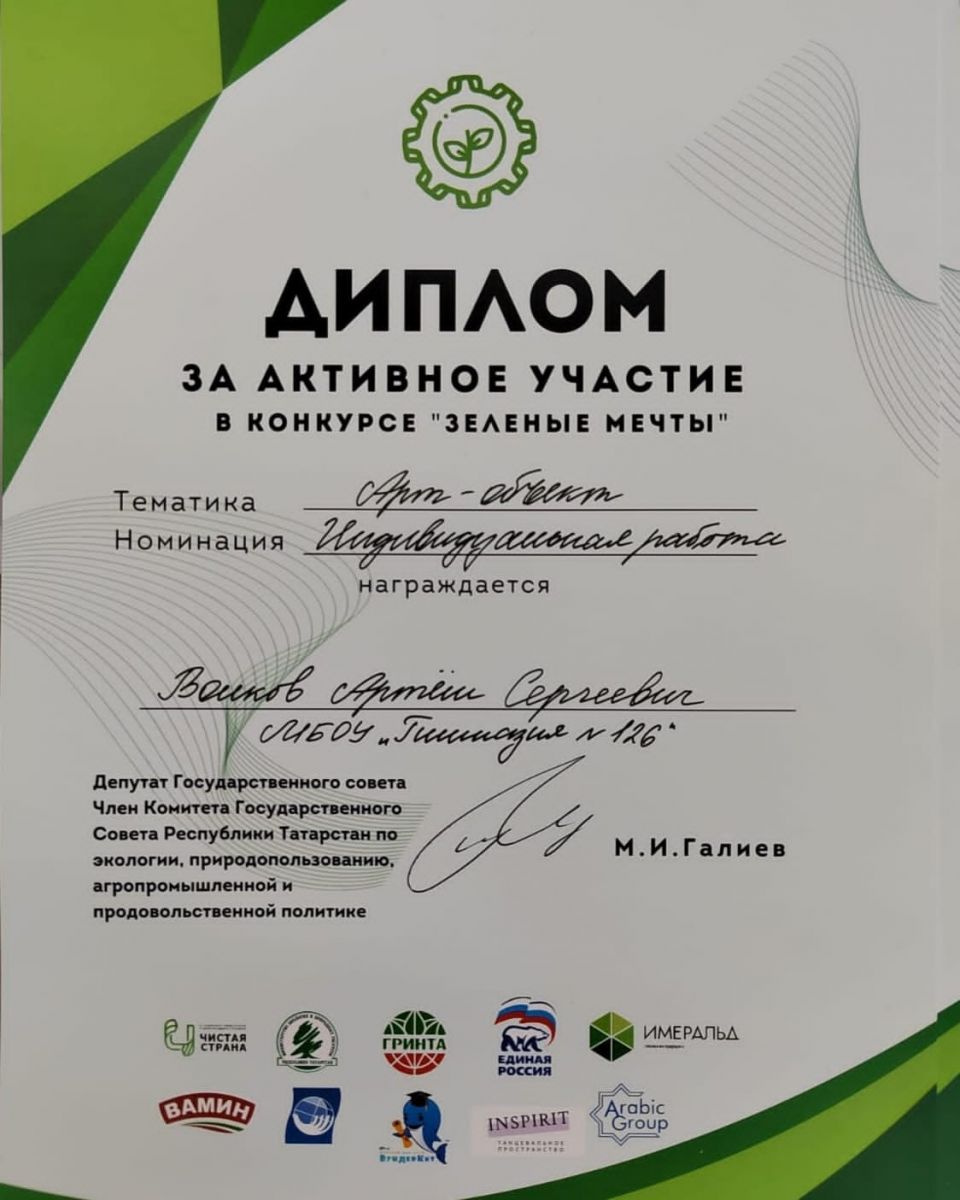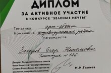 Поздравляем Захарова Егора, ученика 8А класса за активное участие в конкурсе "Зелёные мечты"