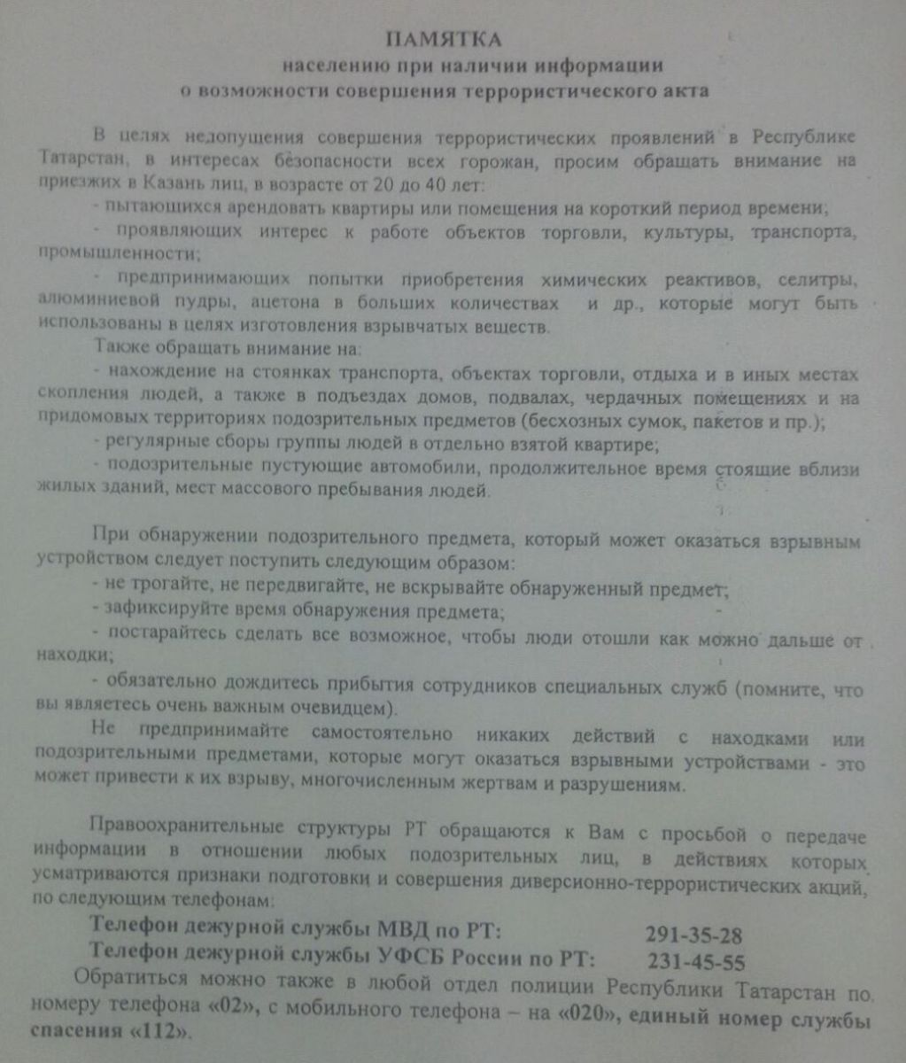 Памятка населению при наличии информации о возможности совершения террористического акта