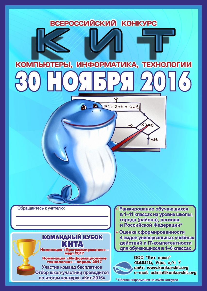 Приглашаем принять участие в девятом Всероссийском конкурсе «КИТ – компьютеры, информатика, технологии», который состоится 30 ноября 2016 года для учащихся 1-11 классов.