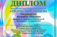 Тәтеш шәһәрендә «Иҗади ТАНДЕМ» республика конкурсы булды. Анда "Задумка» ансамбле, Риана Бикмөхәммәтова катнашты. Укытучылары белән бергә алар ике тапкыр I дәрәҗә лауреатлар булдылар. Укучыларны һәм укытучылары Селиванова Марина Ивановна һәм Бикмуллина Радина Ильяс кызын лаеклы җиңүләре белән котлыйбыз!