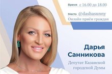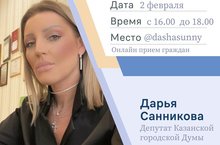 2 февральдә 16.00 сәгатьтән 18.00 сәгатькә кадәр Казан шәһәре Думасы депутаты Дарья Санникова гражданнарны онлайн кабул итә. Кабул итү урыны @dashasunny