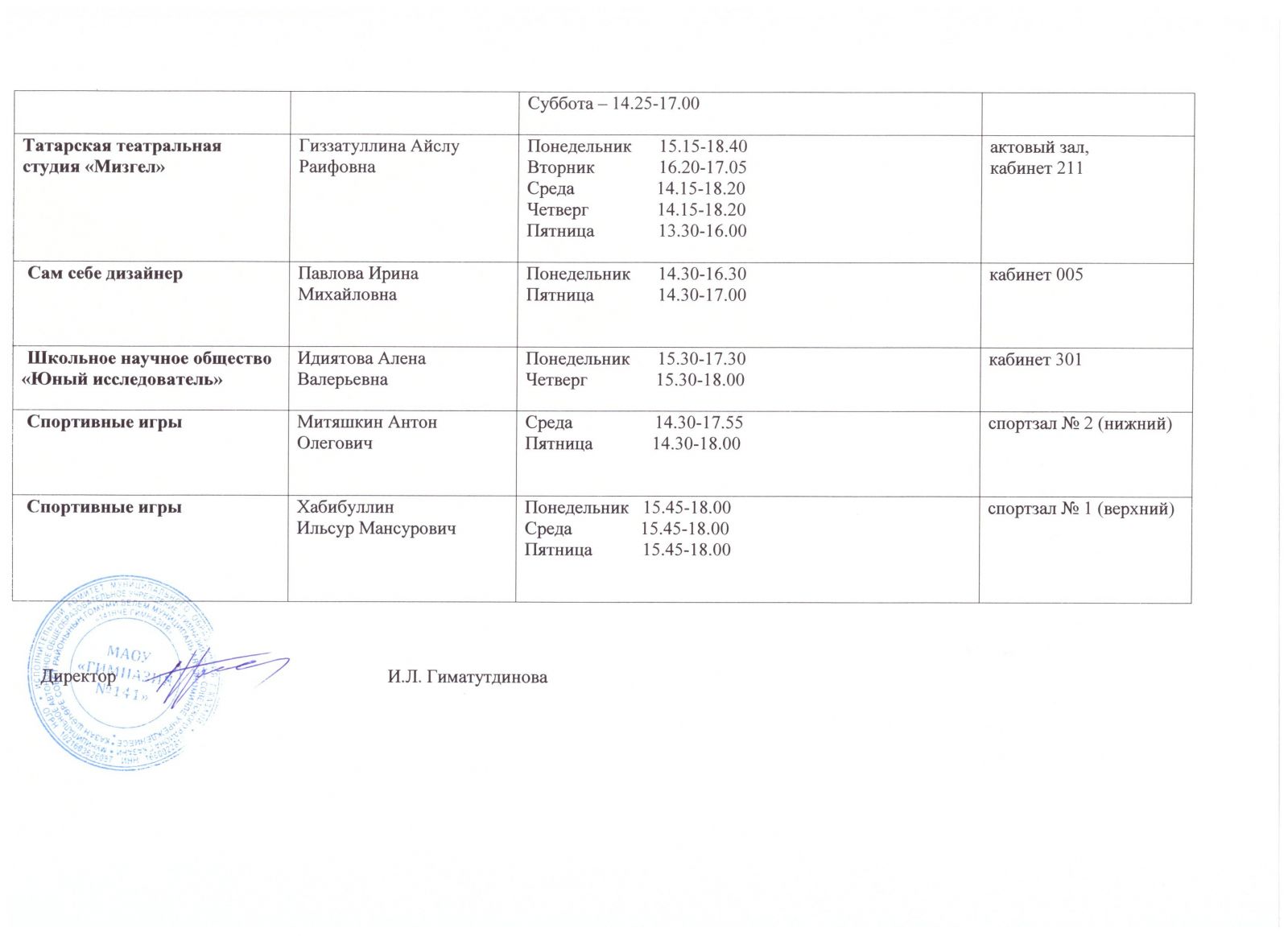 Расписание работы кружков и спортивных секций
