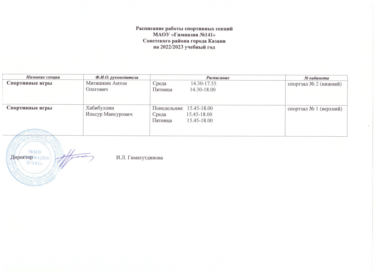 Расписание спортивных кружков и секций на 2022-2023 уч.год