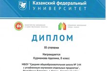 Ученица 10 класса нашей школы Ахтямова Адиля (рук. Муслимова Р.В., Минзянова Г.А. ) показала хорошие достижения, и была награждена дипломом 3 степени. Поздравляем и желаем дальнейших успехов.