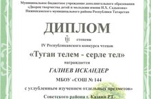 18 февраля 2017 года в городе Нижнекамске проводился IV республиканский конкурс чтецов "Туган телем - серле тел". Учащиеся 2в класса нашей школы Тухбатуллин Бахтияр (руководитель -Залялиева Л.Р.), Галиев Искандер ( руководитель - Макарова И.А.) прошли все 3 этапа конкурса и заняли ТРЕТИЕ места. Аюпова Румия - 3в класс (руководитель - Курманова А.Ш.), и Гимадиева Камилла - 2в класс, (руководитель - Захарова С.А.) - награждены сертификатами участия. Всем желаем дальнейших успехов и поздравляем!