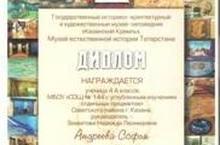 Андреева Софья, ученица 4 А класса участвовала в конкурсе стенгазет «Открытая книга», посвящённом Всемирному дню Земли в музее естественной истории Татарстана и награждена дипломом за победу в номинации «Самая стильная газета». Руководитель Захватова Н.Л.