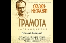 Модина Полина, ученица 4 А класса награждена Грамотой победителя конкурса чтецов по произведениям В.В. Бианки «Сказки-несказки» от Государственного Дарвиновского музея