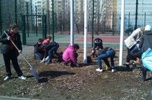 На суббнотнике. Весело и дружно наподим чистоту и порядок на пришкольной территории