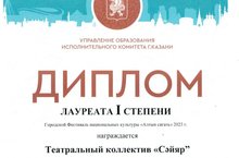 Наш коллектив "Сәйяр" награжден дипломом лауреата 1 степени , а Четверня Анастасия дипломом лауреата 3 степени в номинации "Театральное искусство". Поздравляем всех с успехом! (Руководители: Залялиева Л.Р., Макарова И. А., Курманова А.Ш.)"Алтын сәгать" исемле милли мәдәният фестивале йомгаклары билгеле булды. Мәктәптә эшләп килүче "Сәйяр" балалар төркеме 1нче урынга лаек булды, ә Четверня Анастасия "Театр сәнгате" номинациясендә 3 нче урынны алды. Укучыларны һәм аларны әзерләүче укытучыларны котлыйбыз!(Җитәкчеләре: Курманова А. Ш., Макарова И. А., Җәләлиева Л. Р.)