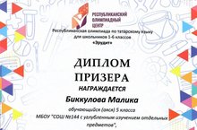 Получили дипломы Республиканской очной олимпиады "Эрудит" по татарскому языку. Поздравляем Биккулову Малику (5в класс) и учителя Макарову И.А.