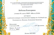 Поздравляем Кобзева Екатерину, ученицу 4Г класса с победой в районном конкурсе экологических маршрутов «Зелёный гид», посвящённого Году родных языков и народного единства в Республике Татарстан.