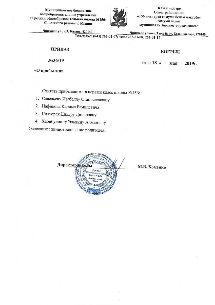 Приказ "О прибытии" №36/19 от 18 мая 2019 (4 человека).