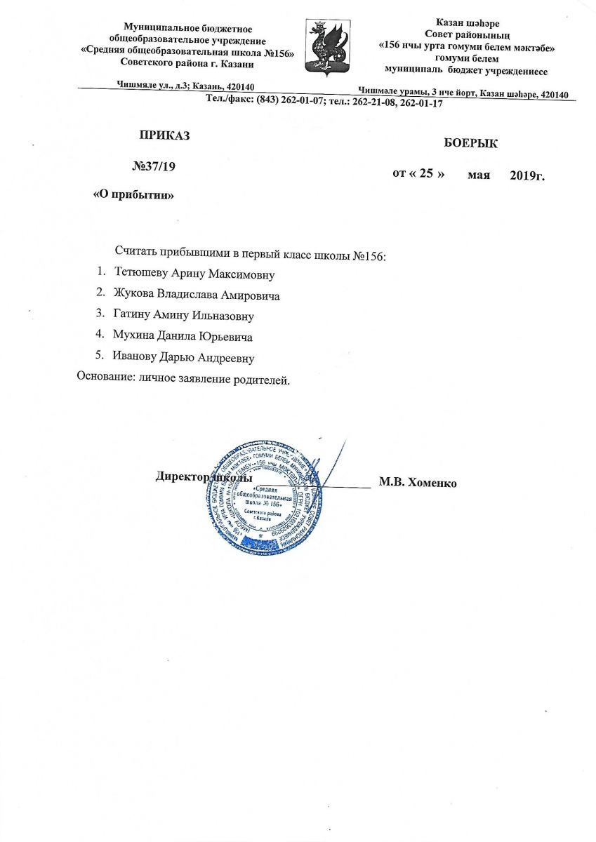 Приказ "О прибытии" №37/19 от 25 мая 2019 (5 человек).