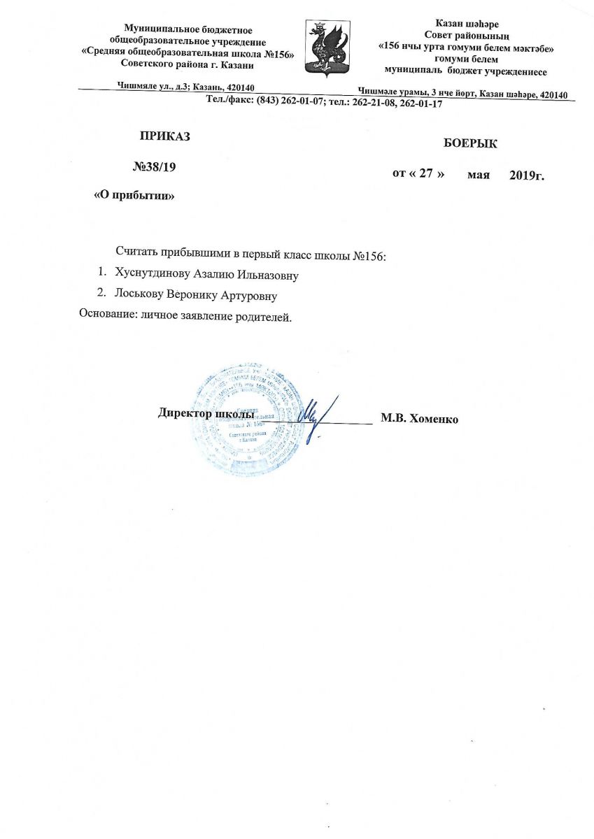 Приказ "О прибытии" №38/19 от 27 мая 2019 (2 человека).