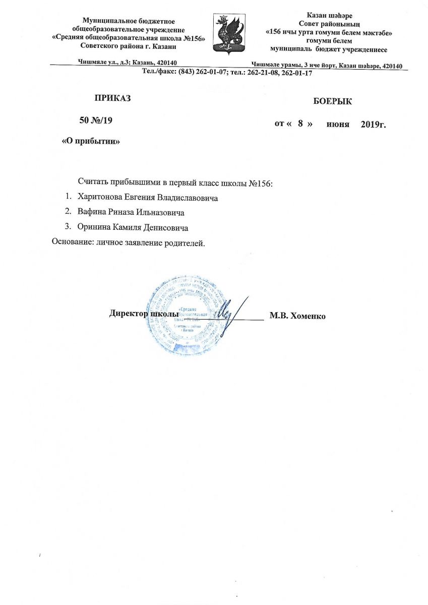 Приказ "О прибытии" №50/19 от 8 июня 2019 (3 человека).