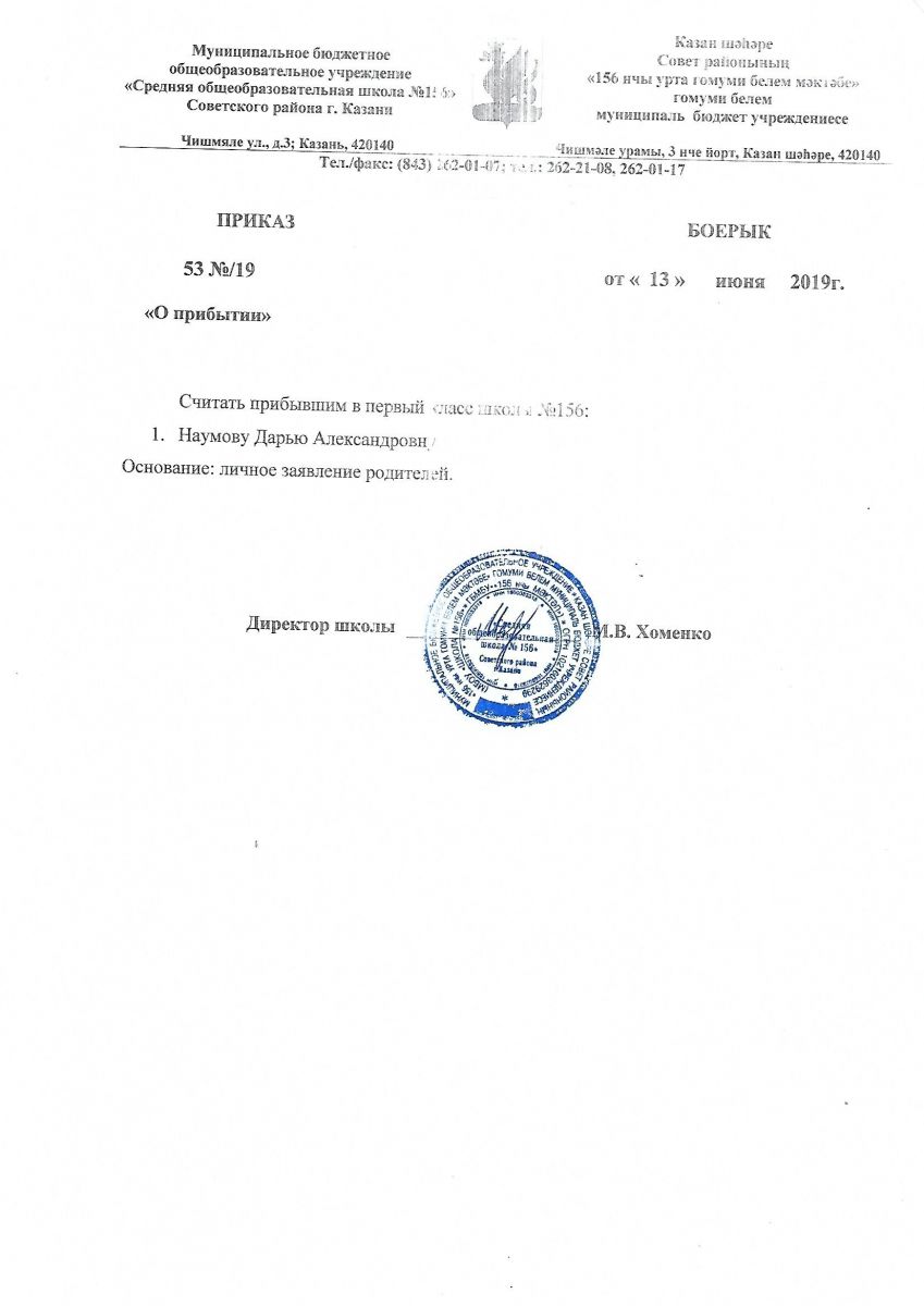 Приказ "О прибытии" №53/19 от 13 июня 2019 (1 человек).