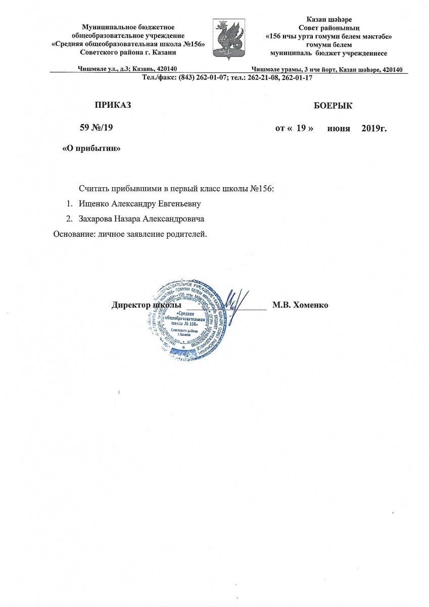 Приказ "О прибытии" №59/19 от 19 июня 2019 (2 человекa).