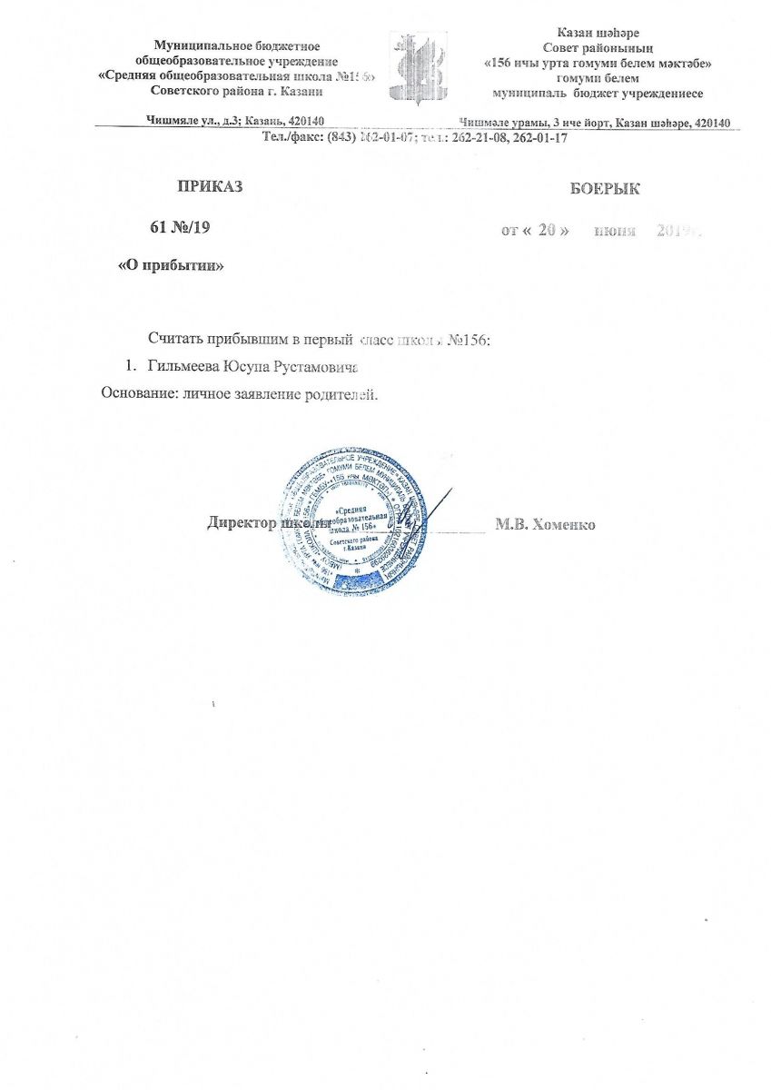 Приказ "О прибытии" №61/19 от 20 июня 2019 (1 человек).