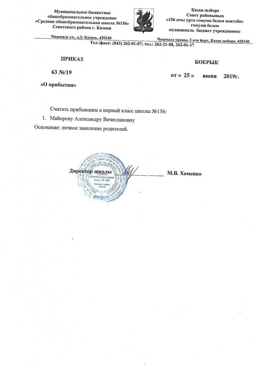 Приказ "О прибытии" №63/19 от 25 июня 2019 (1 человек).