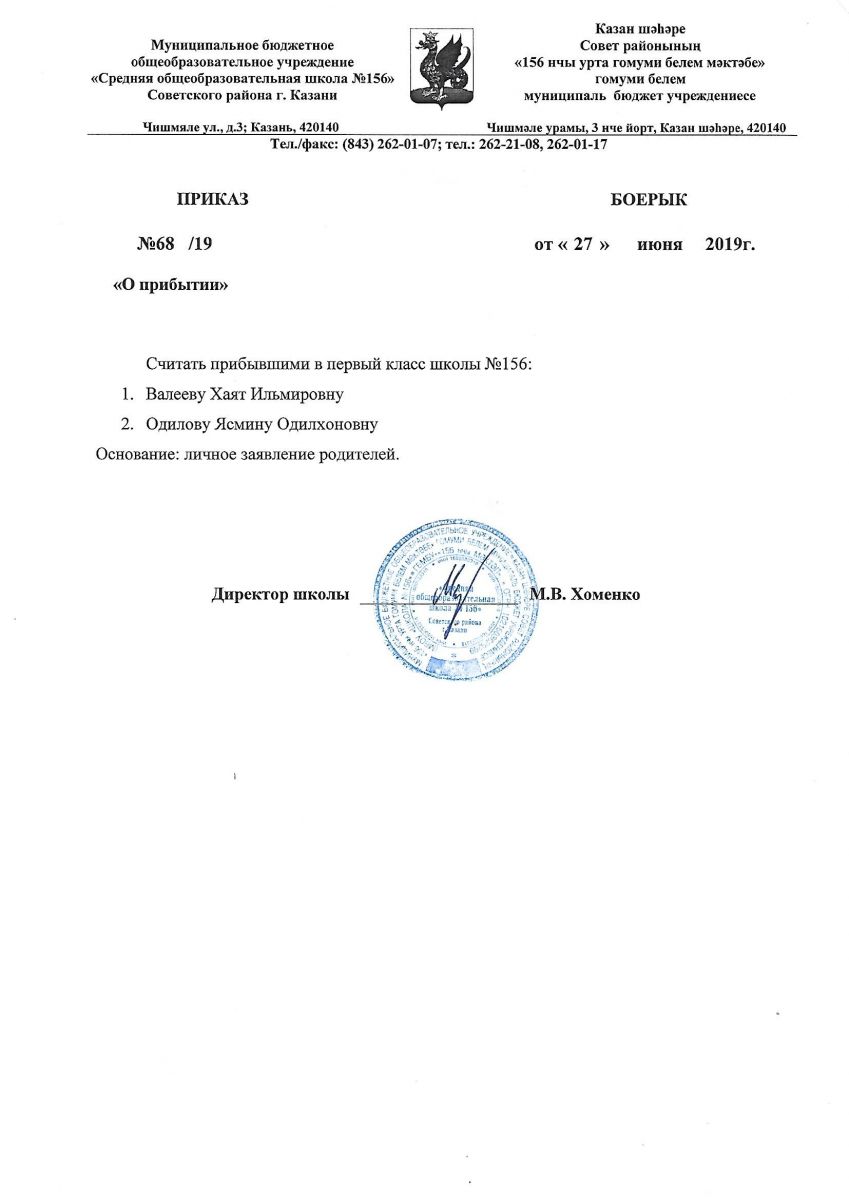 Приказ "О прибытии" №68/19 от 27 июня 2019 (2 человек).