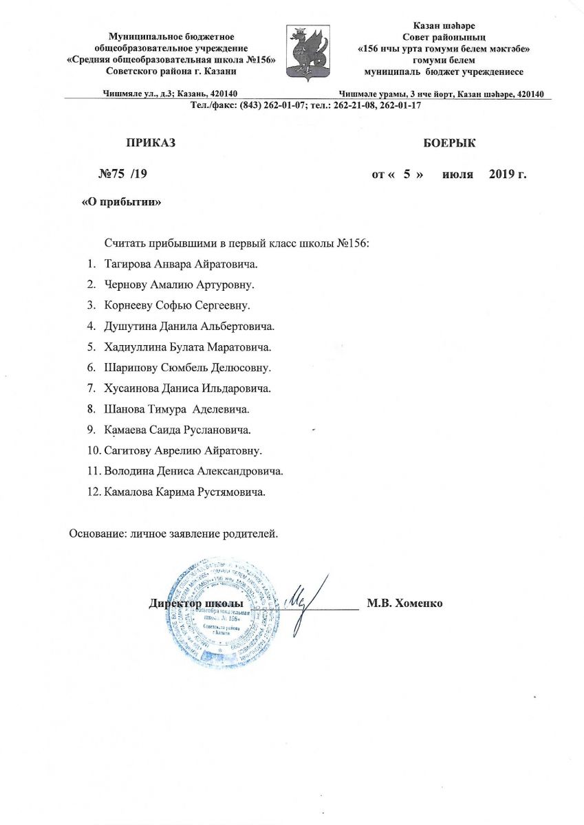 Приказ "О прибытии" №75/19 от 5 июля 2019 (12 человек).
