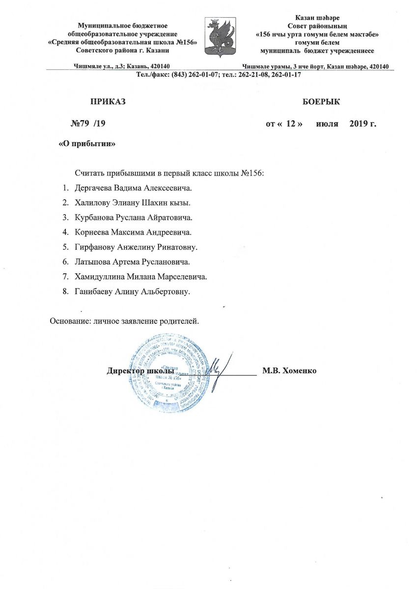 Приказ "О прибытии" №72/19 от 1 июля 2019 (18 человек).