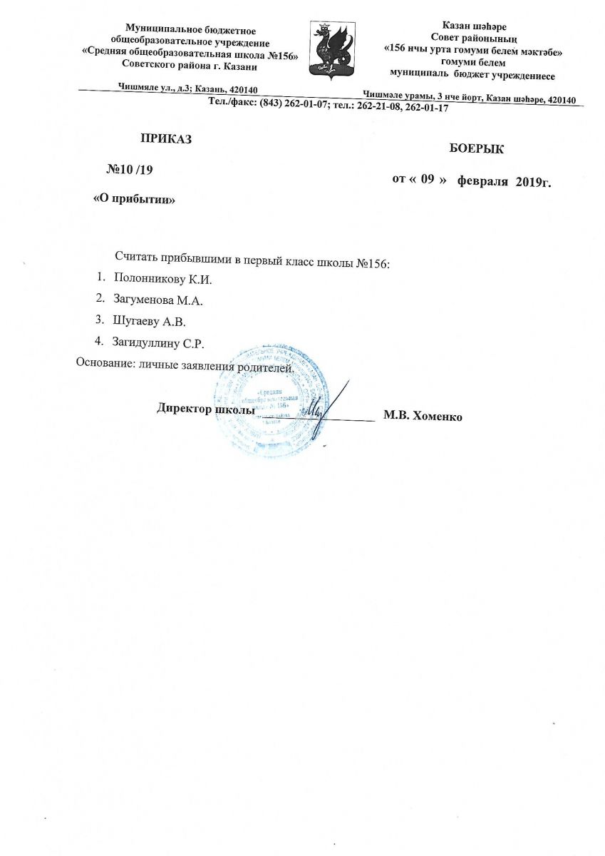 Приказ "О прибытии" №10/19 от 9 февраля 2019 (4 человека).