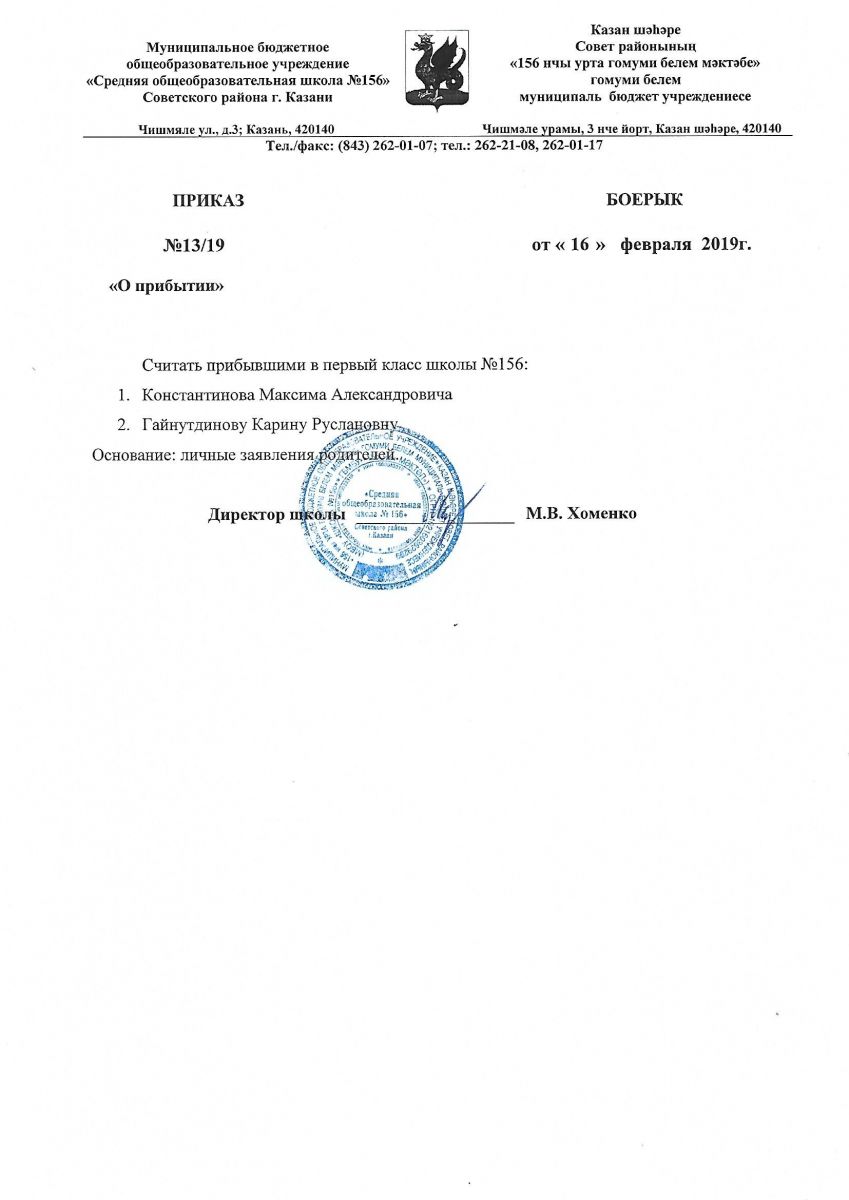Приказ "О прибытии" №13/19 от 16 февраля 2019 (2 человека).