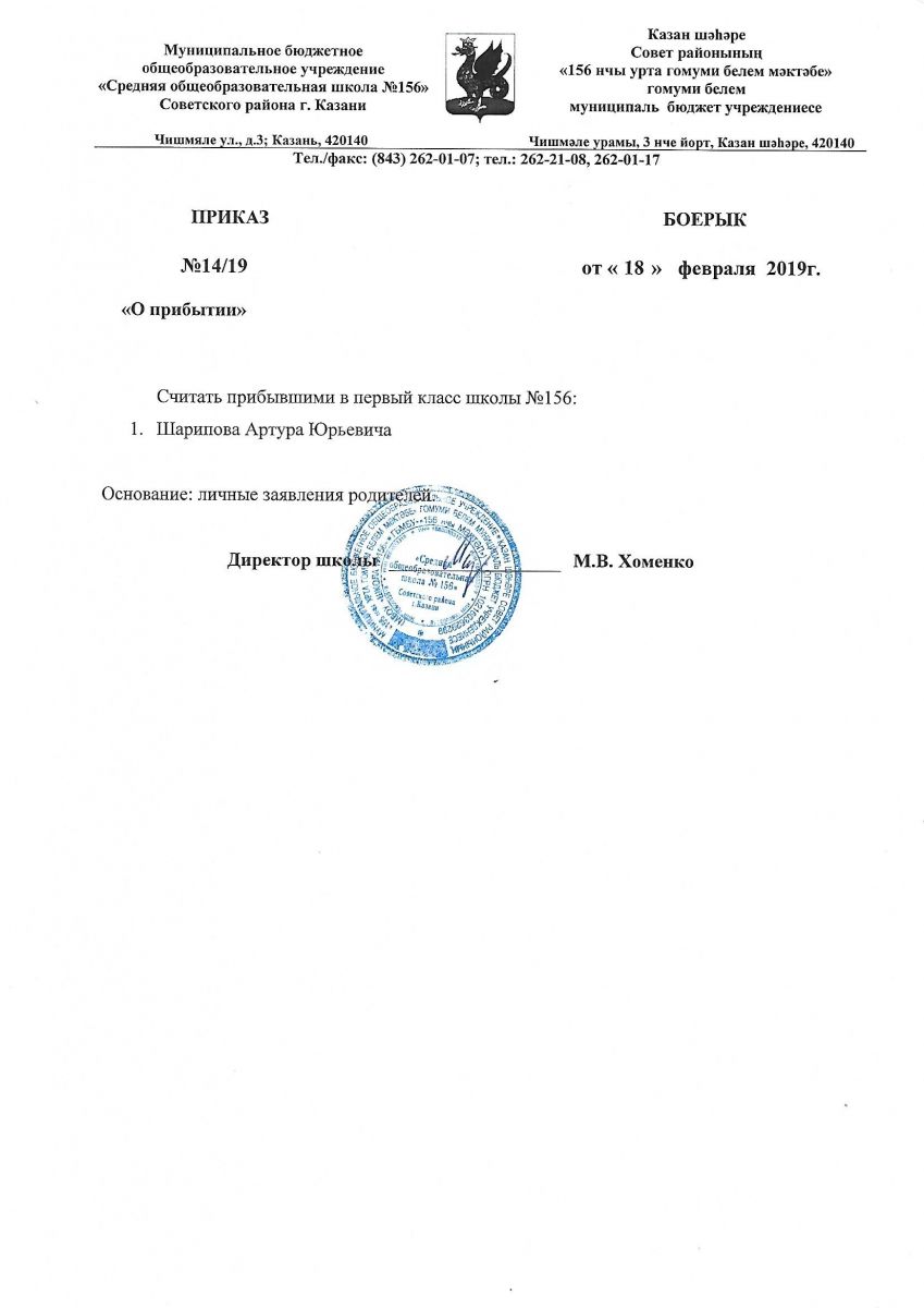 Приказ "О прибытии" №14/19 от 18 февраля 2019 (1 человек).