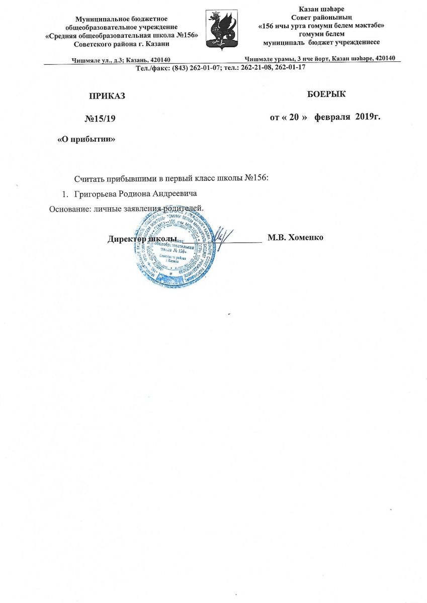 Приказ "О прибытии" №15/19 от 20 февраля 2019 (1 человек).