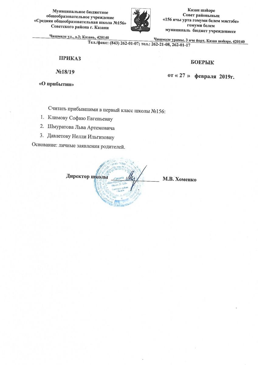 Приказ "О прибытии" №18/19 от 27 февраля 2019 (3 человека).