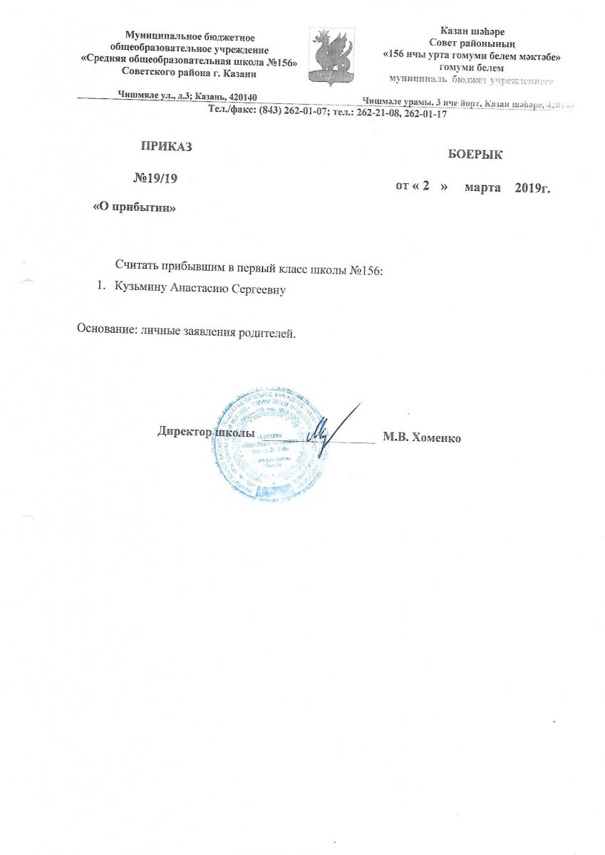 Приказ "О прибытии" №19/19 от 2 марта 2019 (1 человек).