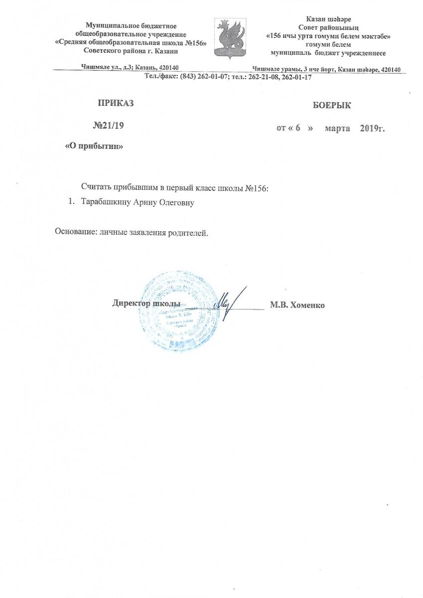 Приказ "О прибытии" №21/19 от 6 марта 2019 (1 человек).
