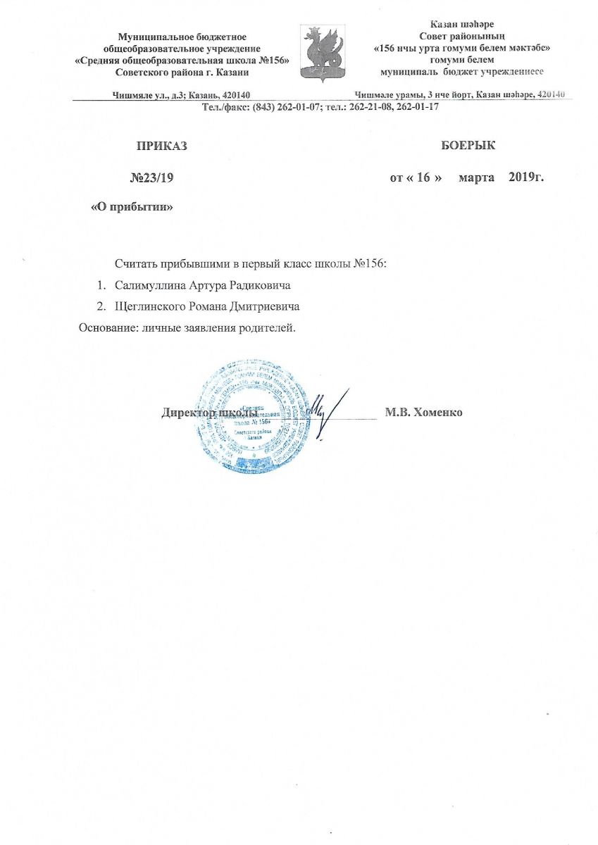 Приказ "О прибытии" №23/19 от 16 марта 2019 (2 человека).