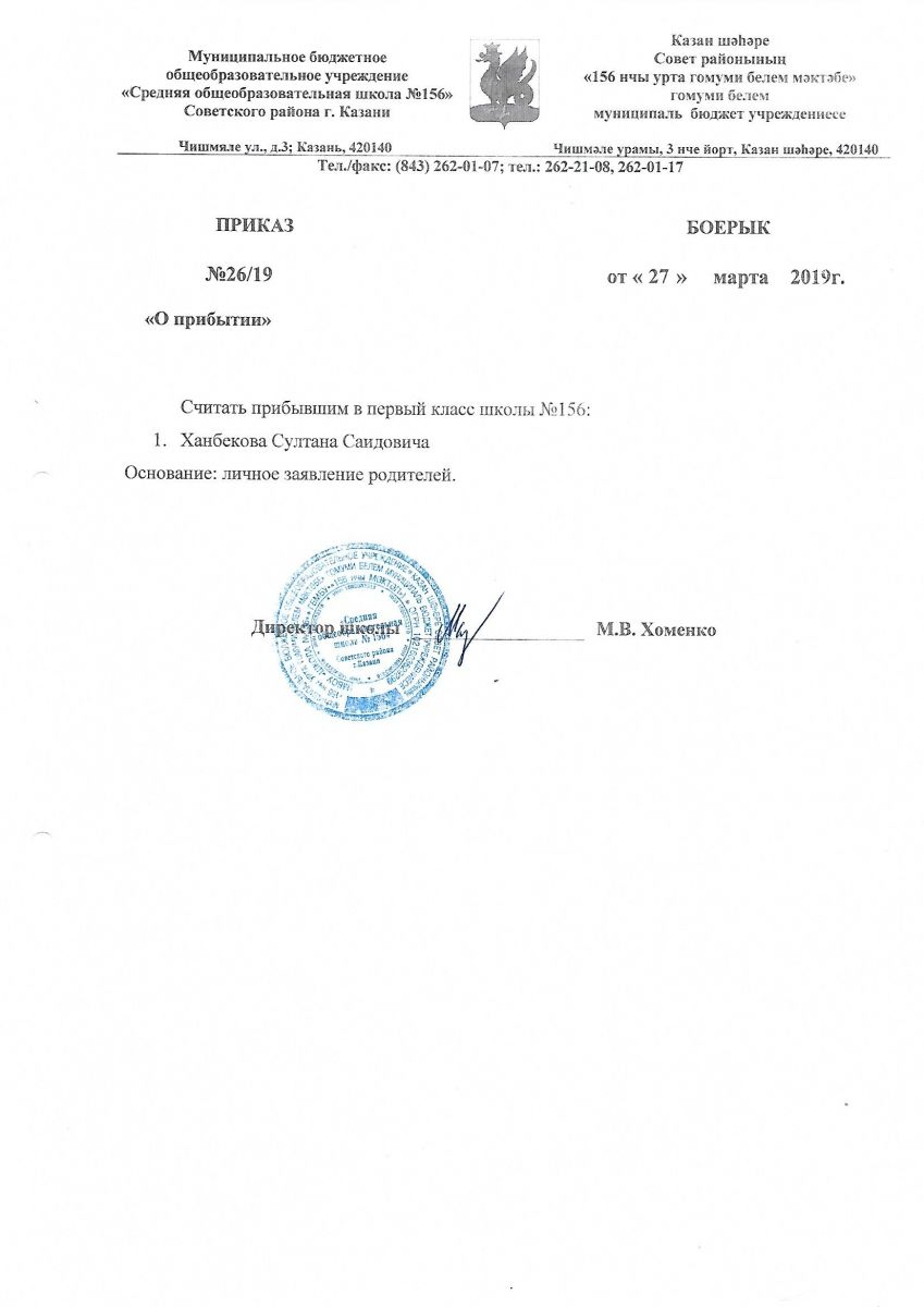 Приказ "О прибытии" №26/19 от 27 марта 2019 (1 человек).